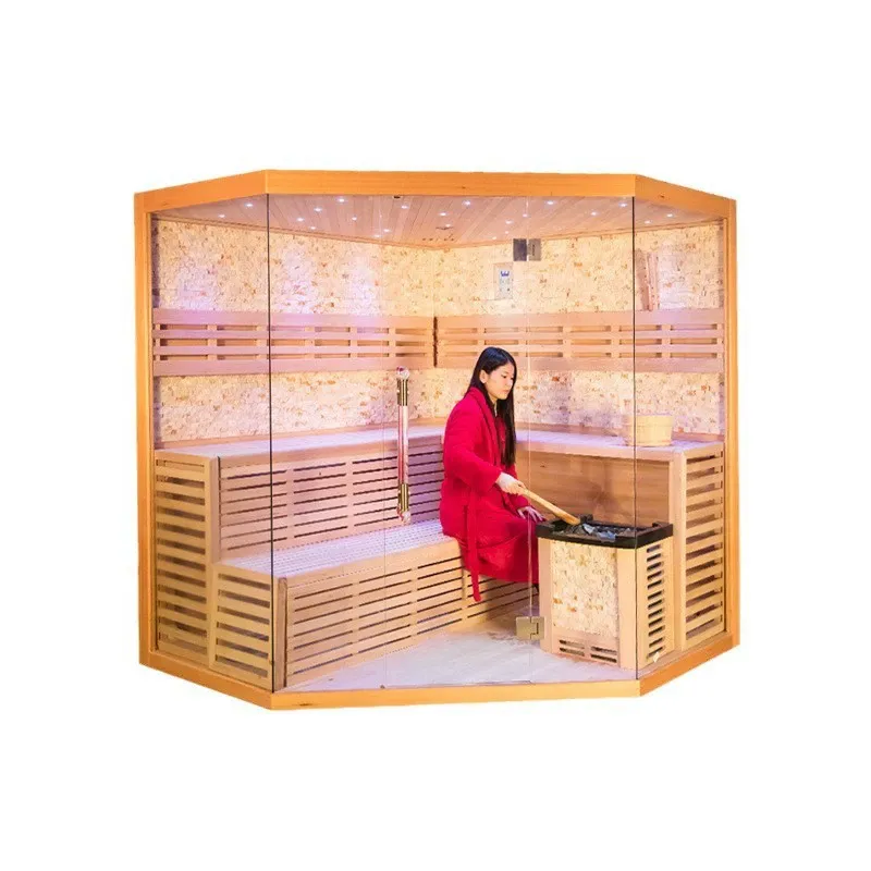 Denna Hemlock-bastu med 3-sidigt glas intelligent kontrollsystem integrerar förstklassiga material, transparent design, intelligent kontroll och säkerhetsgarantier, med noggrant hantverk från kärnkomponenter till detaljerade tillbehör. Oavsett om den används som en privat avkopplingsplats hemma för professionella bastuupplevelser i späckade scheman, eller i kommersiella miljöer som hotell, SPA-klubbar och fitnesscenter för att tillhandahålla tjänster av hög kvalitet, möter den perfekt olika behov – och skapar en bekväm, hälsosam och professionell bastuupplevelse för dig.