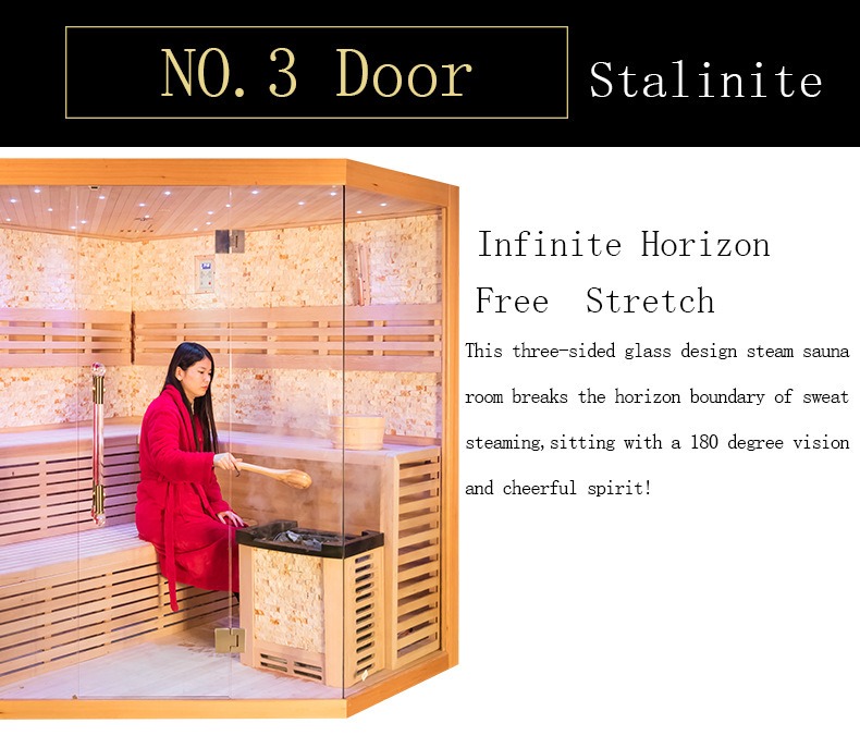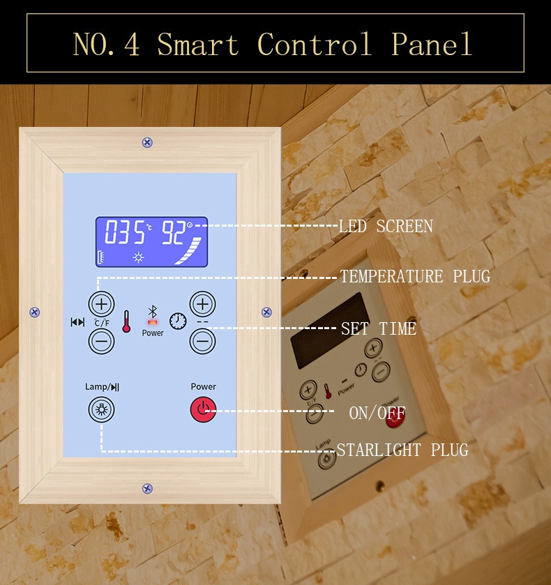 Innovativt med en tresidig Stalinite specialglasdörrstruktur, genomgår detta glas en speciell högtemperaturhärdningsbehandling, vilket ger enastående värmebeständighet och slagtålighet. Den bibehåller stabilitet även vid temperaturer över 70 ℃ inne i bastun, med ultrahög transparens och ingen optisk distorsion. Den tresidiga glasdesignen uppnår en 180-graders fri vidvinkel, vilket helt bryter den trånga och instängda känslan av traditionella bastur. Användare kan bibehålla visuell kontakt med den yttre miljön medan de njuter av bastun, vilket gör den idealisk för hemmabalkonger, innergårdar och andra scenarier – vilket gör att du kan uppskatta utomhuslandskap samtidigt som du upplever värmeterapi för en mer avslappnad och bekväm kropp och själ. Dessutom skapar det internt integrerade stjärnljusmiljösystemet en blinkande stjärneffekt genom dolda LED-ljusremsor på ovan- och sidoväggarna. Det mjuka ljuset kompletterar den varma ångan, lindrar effektivt ögontrötthet och skapar en uppslukande och behaglig bastuatmosfär.
