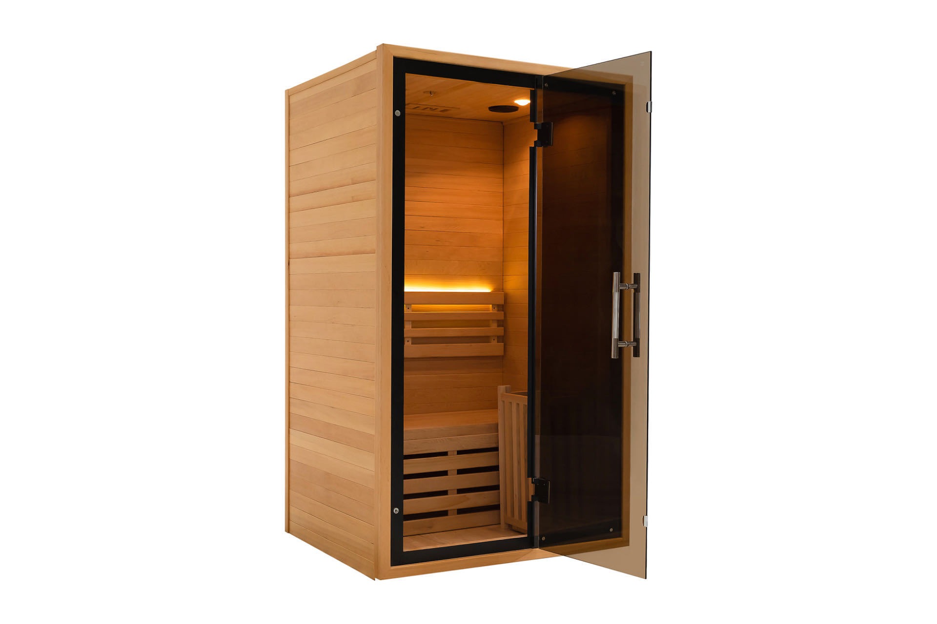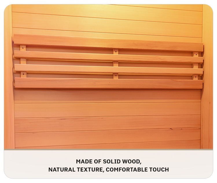 Två premium kanadensiska träslag, Hemlock och Red Cedar, väljs ut. Träet är hårt och hållbart, med tydlig naturlig struktur och jämn elegant färg. De naturliga egenskaperna hos varje träbit ger bastun en unik struktur, som injicerar naturliga och avancerade estetiska gener i ditt välbefinnande i ditt hem. Infraröd bastu inomhus för hemmet.