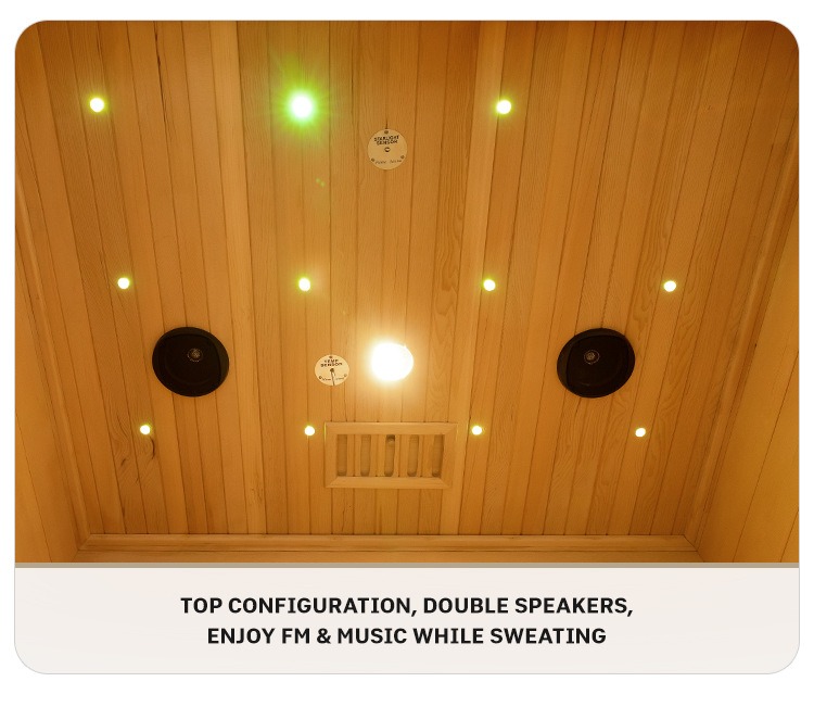 Ett system med dubbla högtalare är konfigurerat på toppen som stöder FM-radio och musikuppspelning. Du kan njuta av dina favoritmelodier eller radioprogram medan du svettas, vilket uppgraderar den uppslukande bastuupplevelsen.