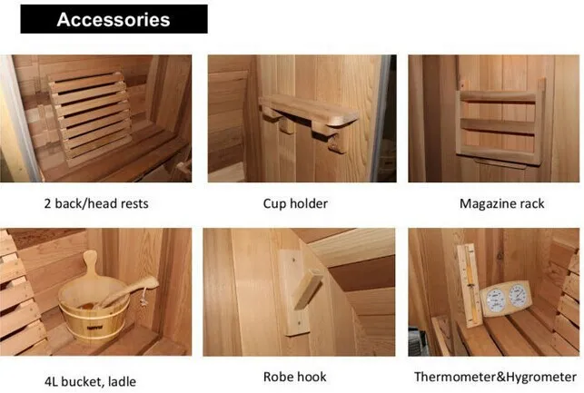 - Bekvämt tillbehör: Mugghållare, tidningsställ, inbyggd klädhängare (för att förvara kläder och handdukar avslappnad, eliminera röran under bastupass);