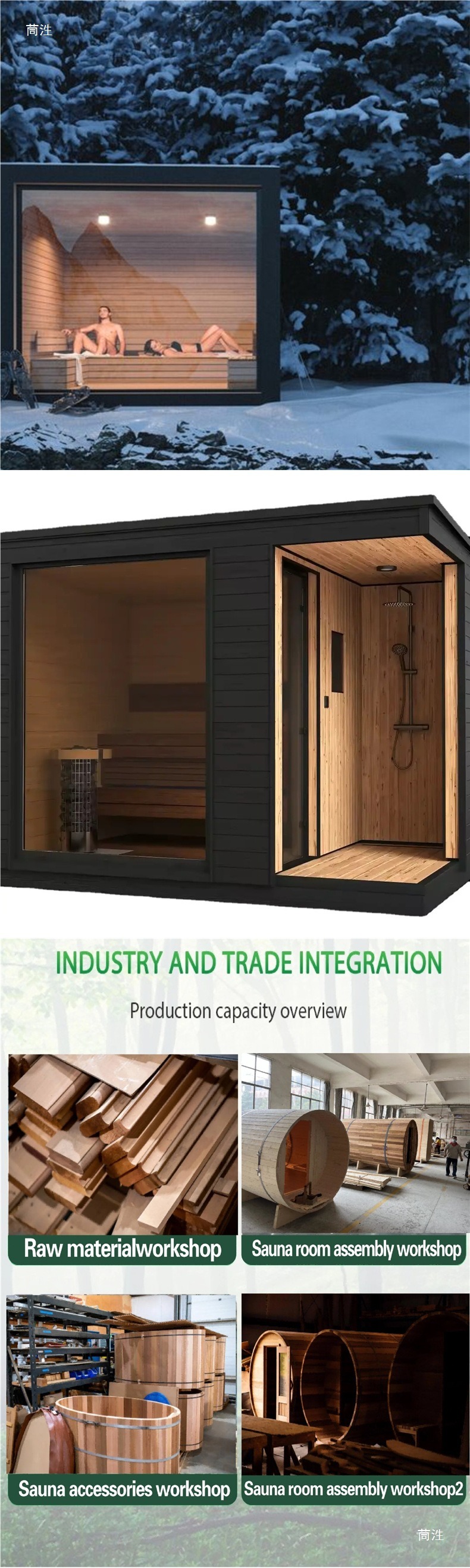 - Produktionsprocess: Standardiserad produktion omfattar "råvarubearbetning - montering av kärnkomponenter - inspektion av färdig produkt". Detaljer som bastuugnens värmeprestanda, duschsystemets vattentäthet och ytterhöljets rostskyddsbeläggning genomgår flera tester för att säkerställa stabil och pålitlig utomhusanvändning.