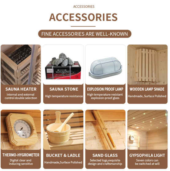 • Tillbehör för övervakning och upplevelse: Känslig temperatur- och fuktighetsmätare, stocksandtimer (timing + rituell känsla), handpolerad trähink och slev, återställer den traditionella basturitualen samtidigt som du säkerställer bekväm användning avUtomhus glasdörr utomhus ångrum.