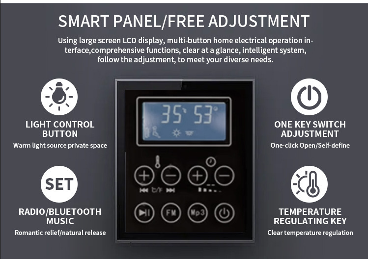 • Exakt temperaturkontroll: Stöder förfinad temperaturjustering, visar aktuell temperatur i realtid, vilket säkerställer en stabil och bekväm bastumiljö förUtomhus glasdörr utomhus ångrum.