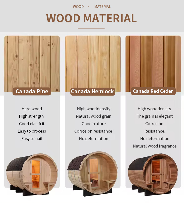 • Träanpassning: Väljer högkvalitativt kanadensiskt importerat utomhusspecifikt trä - furu (hög hårdhet, kostnadseffektiv, antikorrosionsbehandlad), hemlock (hög densitet, fuktbeständig och deformationsbeständig) och västerländsk röd ceder (naturligt korrosiv, med naturlig trädoft, stark utomhusmiljö motståndskraft mot krav på olika väderbeständighet för utomhusbruk),Utomhus glasdörr utomhus ångrum.